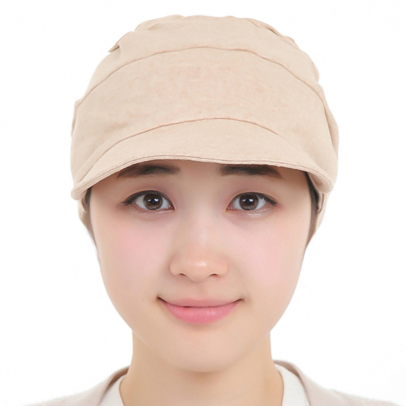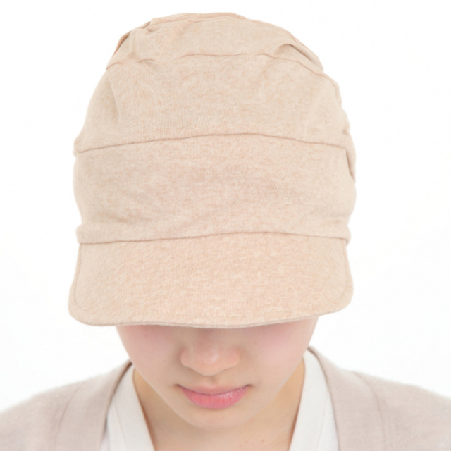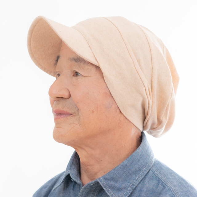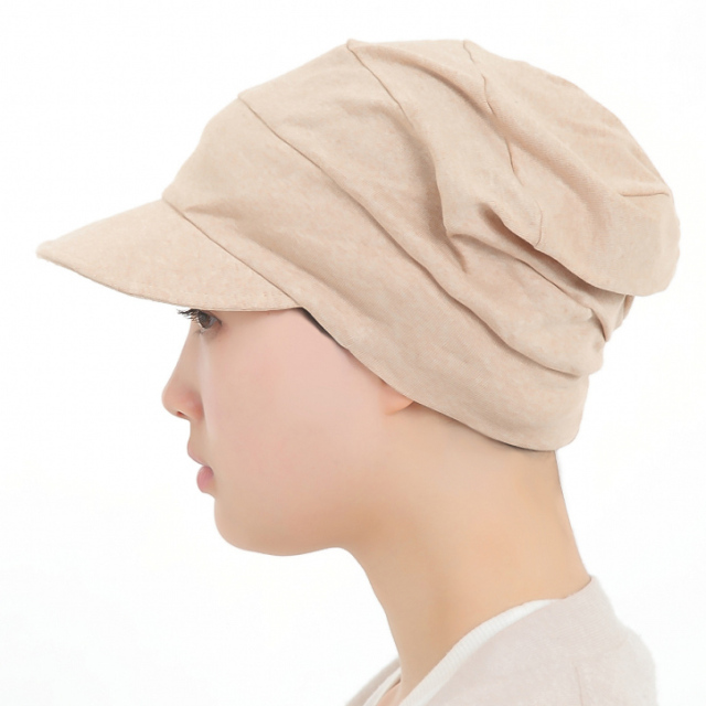 オーガニックコットンを使用した医療用つば付き帽子。頭皮に優しく、アトピーや紫外線アレルギーの方にも最適です。抗がん剤治療中の方の頭皮を守りながら、自然なフィット感を提供します。