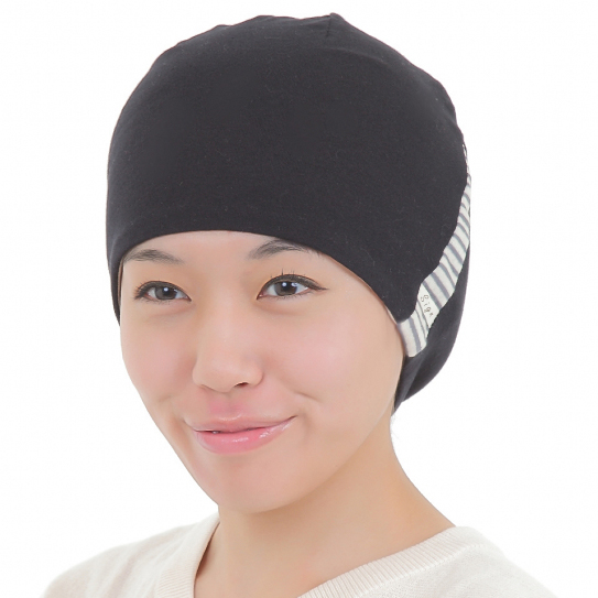「真っ黒よこしま帽子」は、真っ黒のオーガニックコットン生地にボーダー柄をアクセントとしたデザイン性の高い医療用帽子です。長時間の着用でも快適で、抗がん剤治療中の方にもおすすめです。